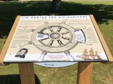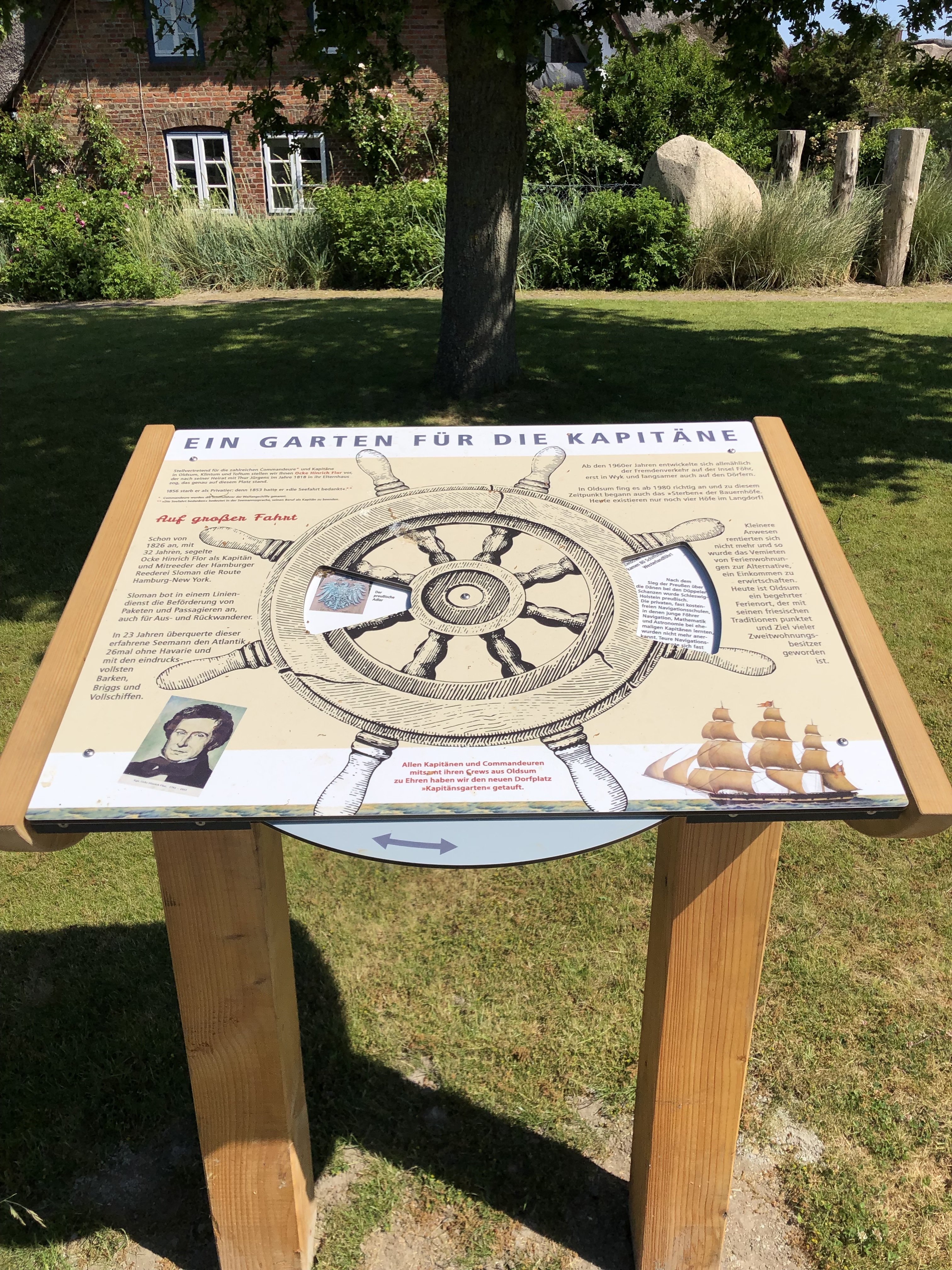 Es gibt wieder kleine neue Sehenswürdigkeiten am Kapitänsgarten. Durch eine Spende des Zeitreise-Teams konnte eine Drehtafel angeschafft werden. Mit Hilfe dieser Tafel können sich Besucher:innen quasi durch die Geschichte der Seefahrt drehen, oft mit direktem Bezug zu den Oldsumer Kapitänen und Commandeuren. Die Idee und der Inhalt stammen von Ingke Wolff, damit steuert Ingke zum wiederholten Mal zur Attraktivität vom Kapitänsgarten bei. Außerdem spendete John Sawallisch ein Ankerlicht, sehr passend weil an dieser Stelle ja auch ein bekannter Oldsumer Kapitän sich zur Ruhe setzte und quasi den Anker warf. Die Gemeinde bedankt sich bei allen Spendern und diese sollen demnächst auf einer Tafel im Kapitänsgarten veröffentlicht werden. „Toll wie die Bevölkerung dieses Projekt immer wieder unterstützt, ” betonte der dankbare Bürgermeister Hark Riewerts.