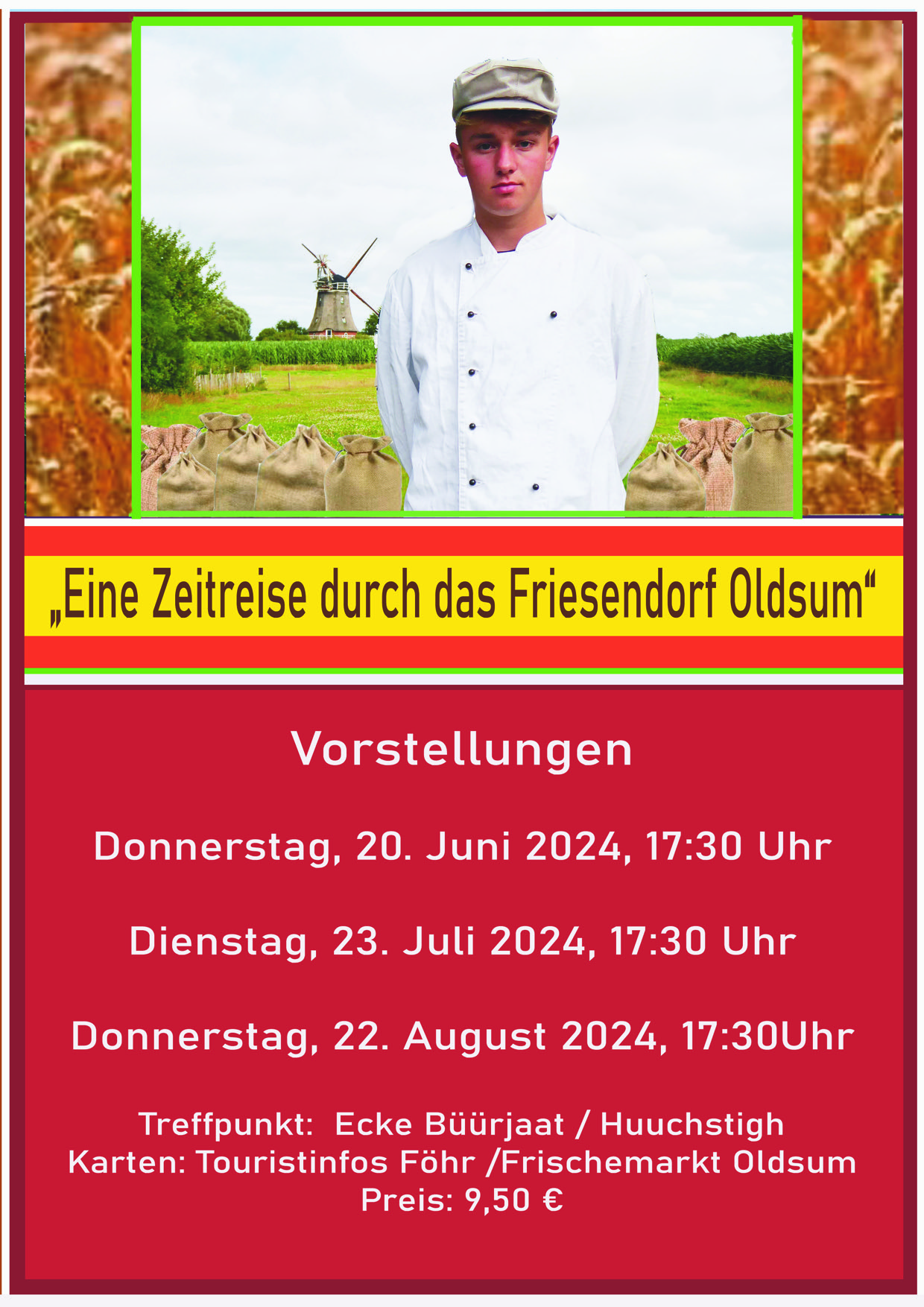 Auch dieses Jahr startet wieder die Zeitreise und der nächste Termin ist bereits am Dienstag den 23.7.24! Außerdem findet am Donnerstag den 25.7.24 der nächste Heimatabend in Oldsum statt. Beide Veranstaltungen starten auf der Kreuzung Büürjaat/ Huuchstigh und da lohnt es sich dabei zu sein!